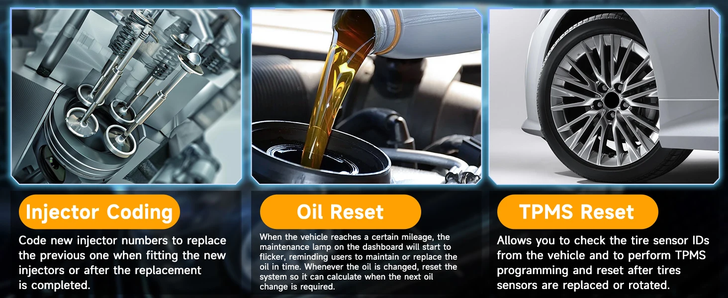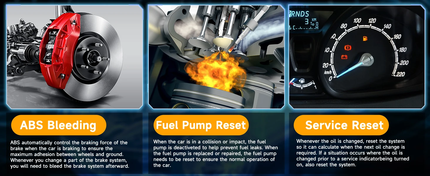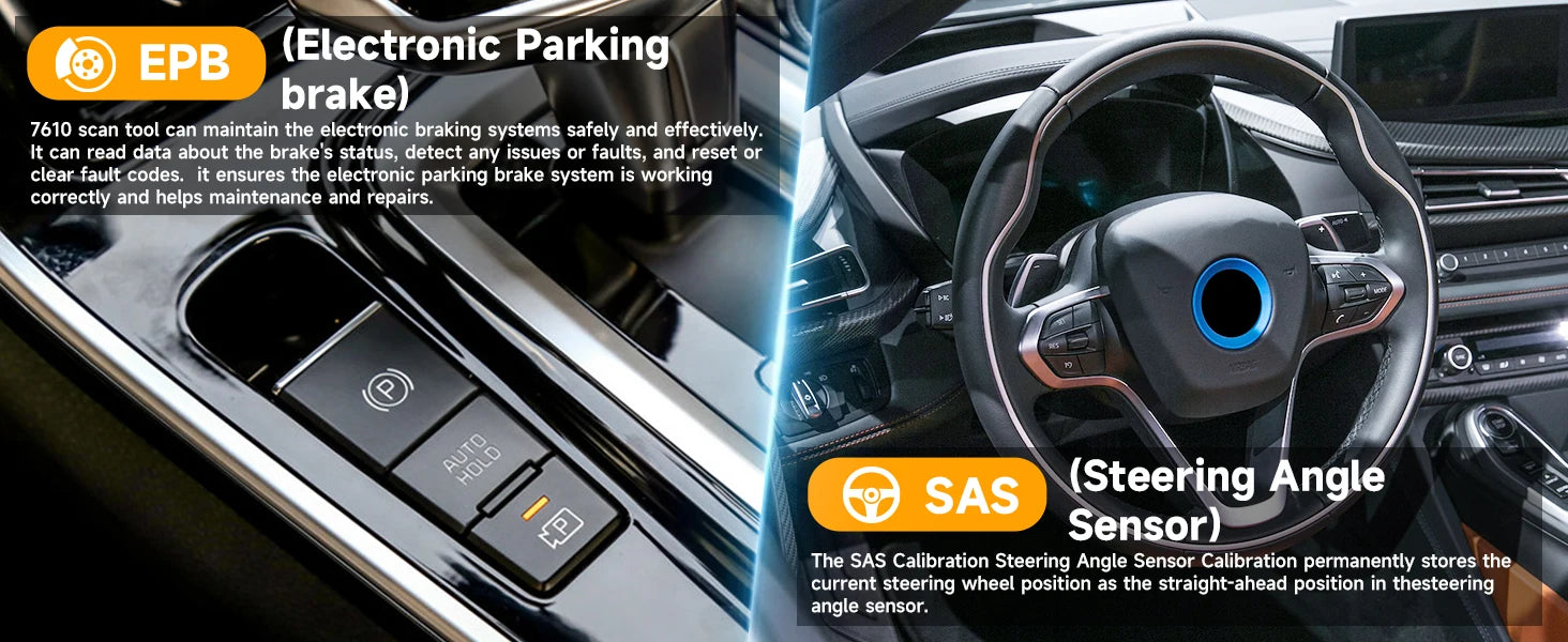 ✔️9.Electronic Parking Brake Reset : Reset the brake pad after repairs in electronic parking brake system are done. Deactivate and activate the brake control system, assist with brake fluid control, open and close brake pads, etc.