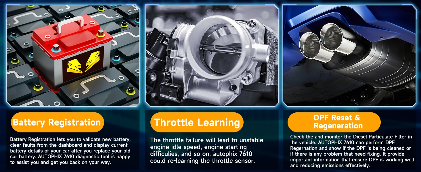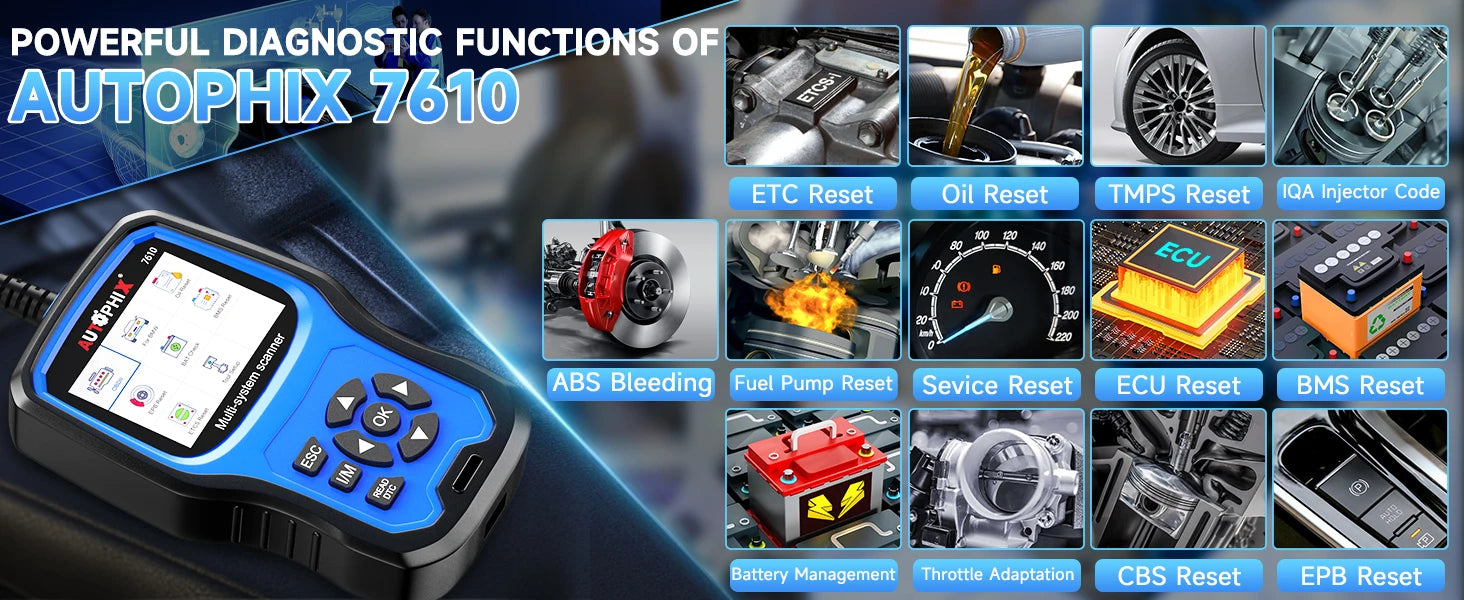 Autophix 7610 diagnostic scanner is capable of reading and clearing diagnostic trouble codes from all major systems including Engine, ABS, SAS, Gearbox, Airbag, immo, TPMS, Reset oil service, Reset Fuel Pump, EGS Clear Adaptions, Force DPF Regeneration, Replace DPF, Battery Health Check, Reset Electronic Parking Brake, Reset Steering angle Sensor, and so on.