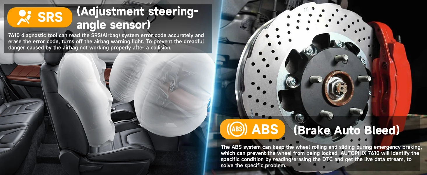 SRS is a device that expands the airbag to protect the passenger before the second collision occurs called Supplemental Restraint System (SRS). 7610 OBD2 scanner can read/clear code, turn off warning light of airbag.