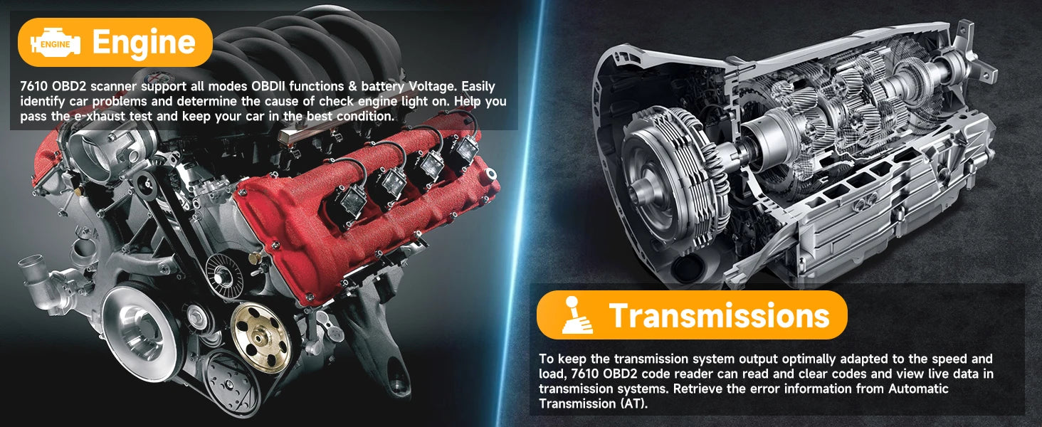 Engine device that provides power for the automobile and the heart of the automobile. It determines the power, economy, stability of the automobile.Unlike other brands’ scanner only for 2005 and newer cars.7610 OBD2 scanner Support OBD2 cars from 1996 to now.It can support