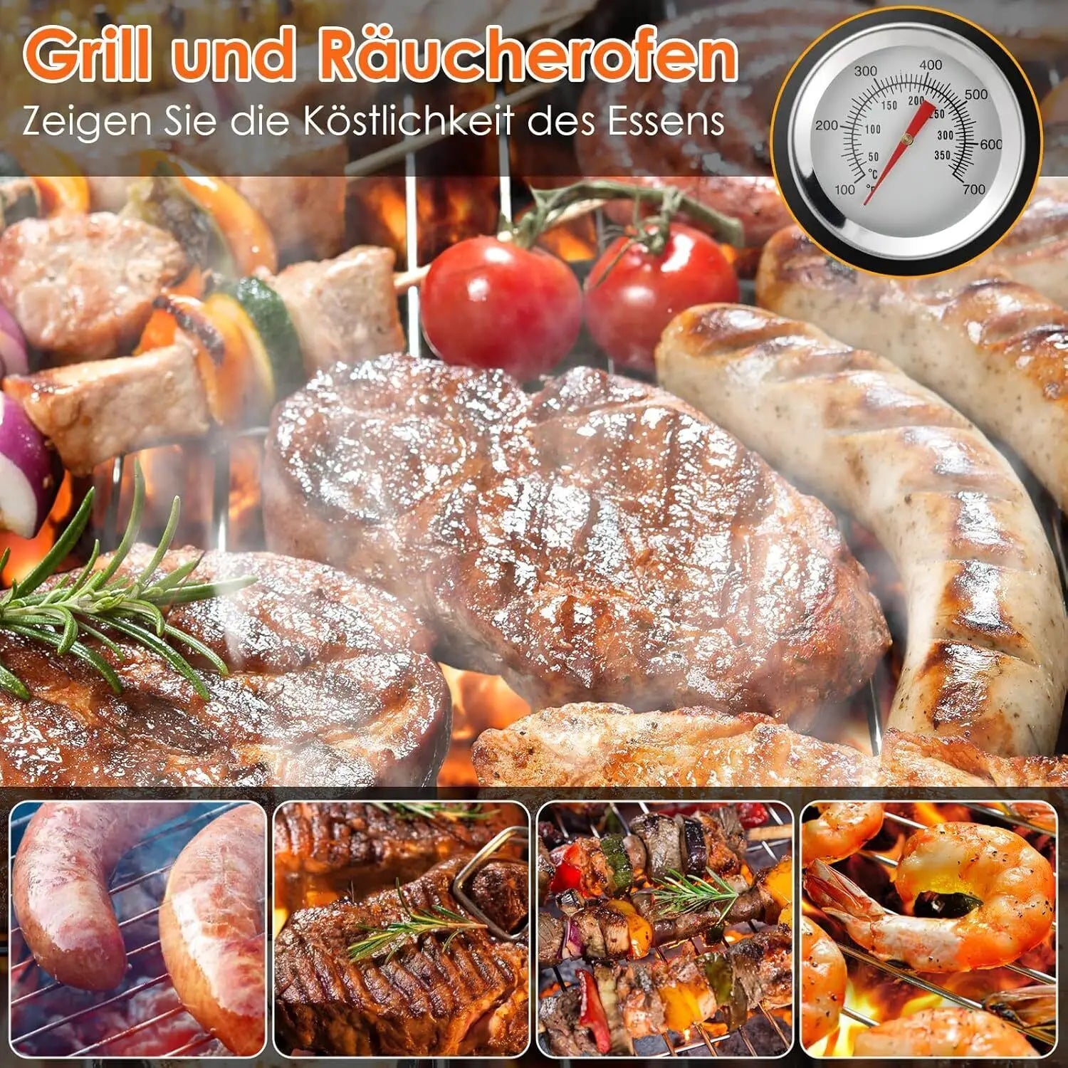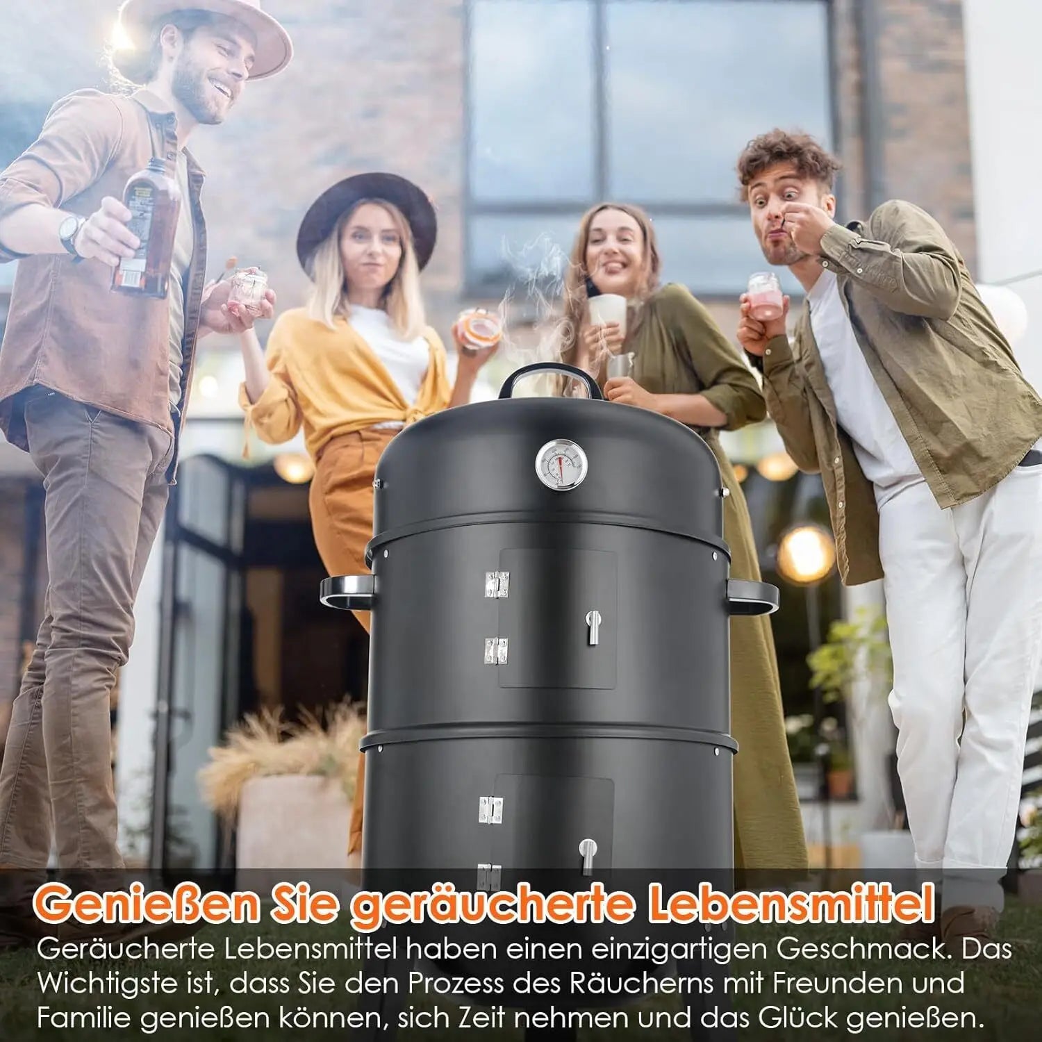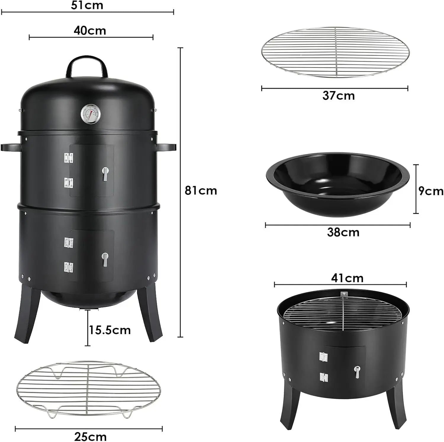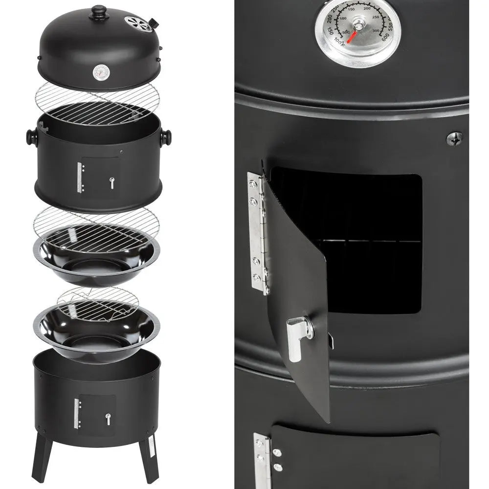With 3 different levels for grilling, cooking and smoking, our multi-purpose charcoal grill is a must-have for all grilling and grilling lovers. Two grills (Ø 38 cm) give you enough space to grill family, friends or neighbors. A thermometer on the lid shows the temperature, which can be easily adjusted through the side door and top vent. The integrated water bowl keeps the temperature low for the perfect smoke and can also be used to steam vegetables. The quick assembly and simple operation of the charcoal grill guarantee great grilling pleasure.