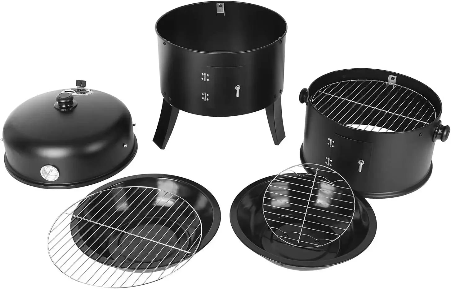 Smoker Oven, 3-in-1 Grill Charcoal Smoker Barrel Water Smoker, Round Smoking BBQ with Lid and Thermometer, 2 Stainless Steel Cooking Grates, 2 Water Bowls Enamel, Charcoal Grill