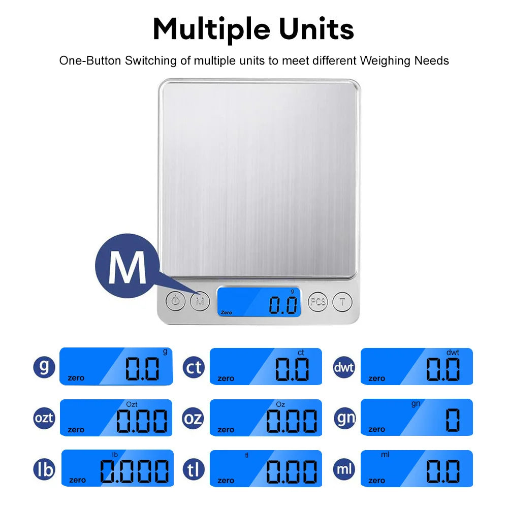 2: Easily convert to 6 units: The digital scale has 6 different weight units, including g, oz, ozt, dwt, ct, gn. Simply press the "M" button to easily and instantly convert units to meet your needs for measuring different things.