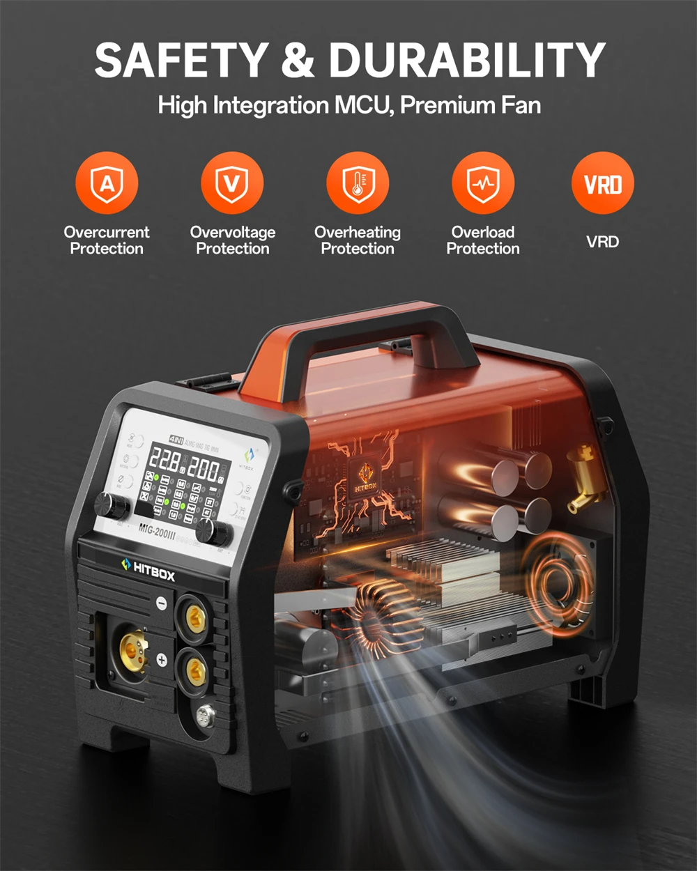 Excellent Quality & Caring Service Each HITBOX welder is professionally tested for industry standards before leaving the factory to ensure it meets the high standards of the industry and ensures safe welding with VRD, over-current/over-voltage/overload/overheating protection.