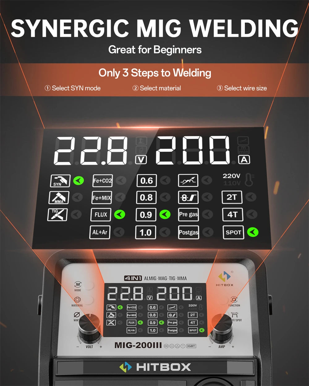 HITBOX 7 in 1 MIG Welding Machine 200A MMA/Gas Flux MIG/Lift TIG/Spot Welding/Spool Gun/Single Pulse Aluminium Welder Home DIY