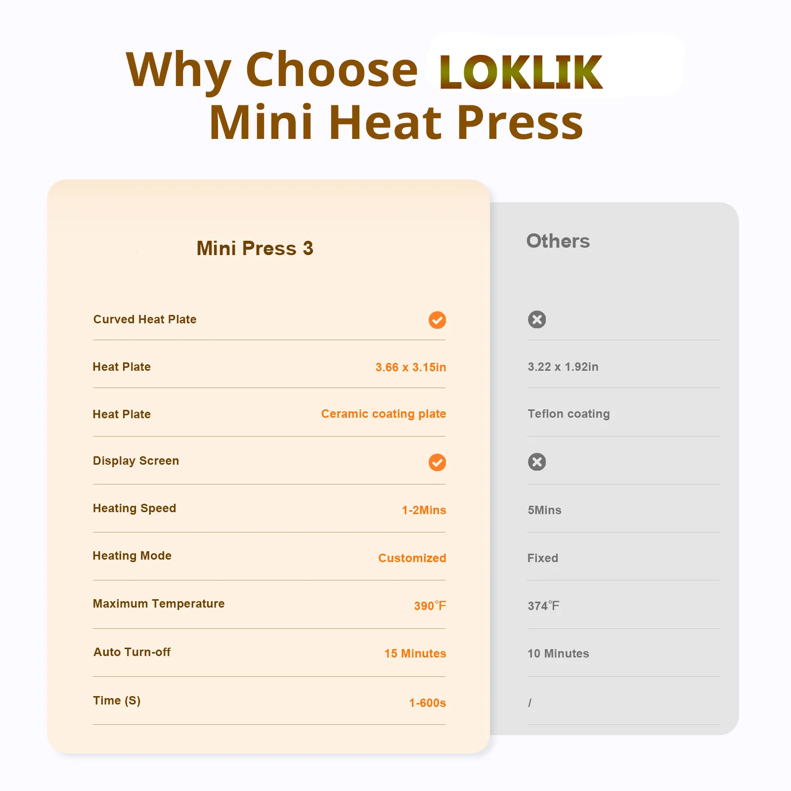 • AUTO SHUT-OFF & MEMORY FUNCTION: For safety, the mini press automatically shuts down after 15 minutes of inactivity. Plus, it features a memory function that preserves the last set temperature and time upon restart, making it convenient for your next use without resetting factory settings