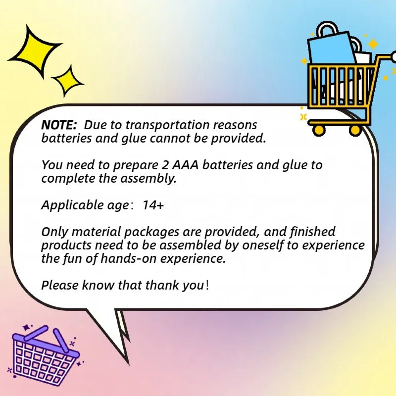 1、Due to transportation restrictions, batteries and glue cannot be provided, you need to prepare batteries and glue to complete the assembly.